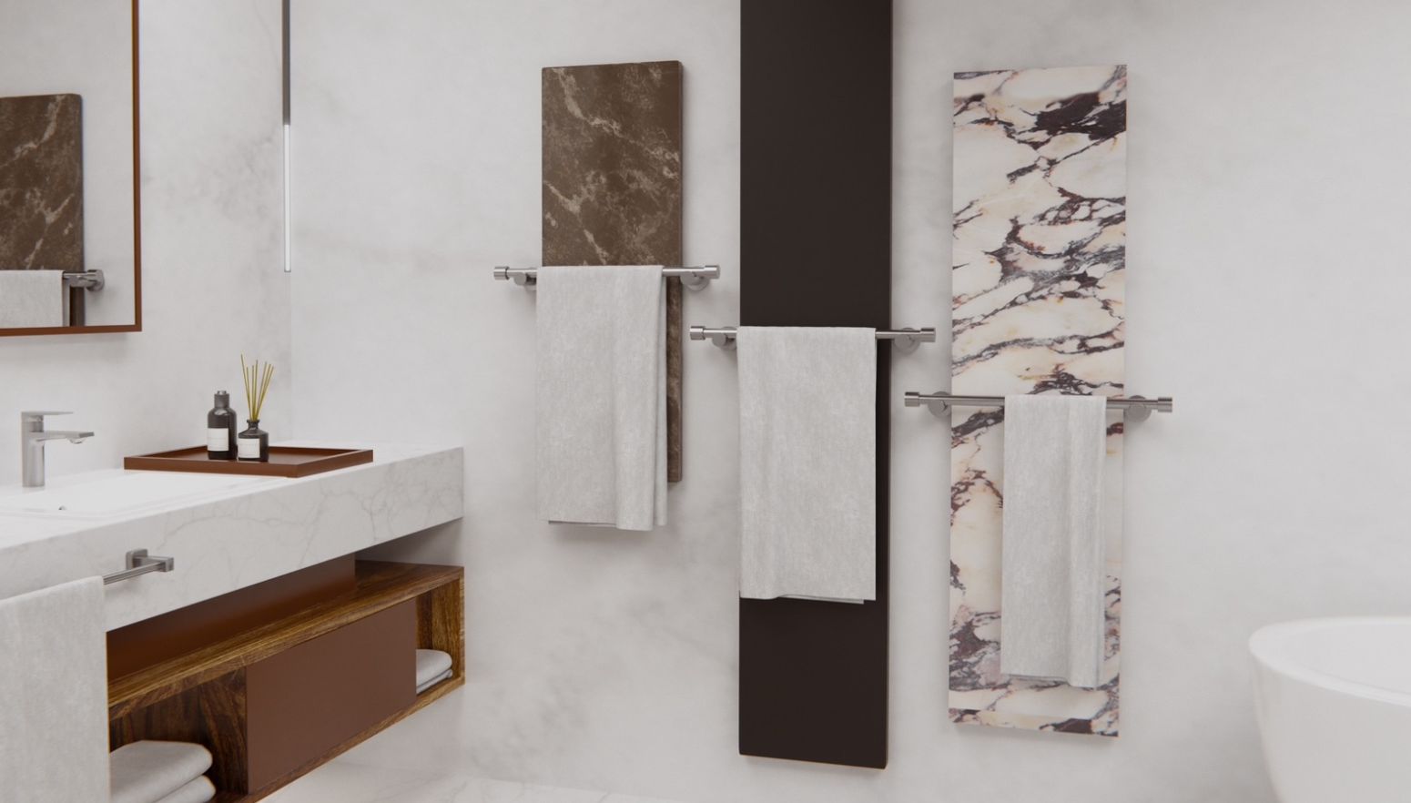 En parallèle de cette évolution vers un système thermique global, la société développe une nouvelle gamme dédiée à la salle de bain. Deux produits ont été introduits : un sèche-serviette et un banc chauffant réalisés à partir de chutes de granit et de marbre, dans une logique d’upcycling.