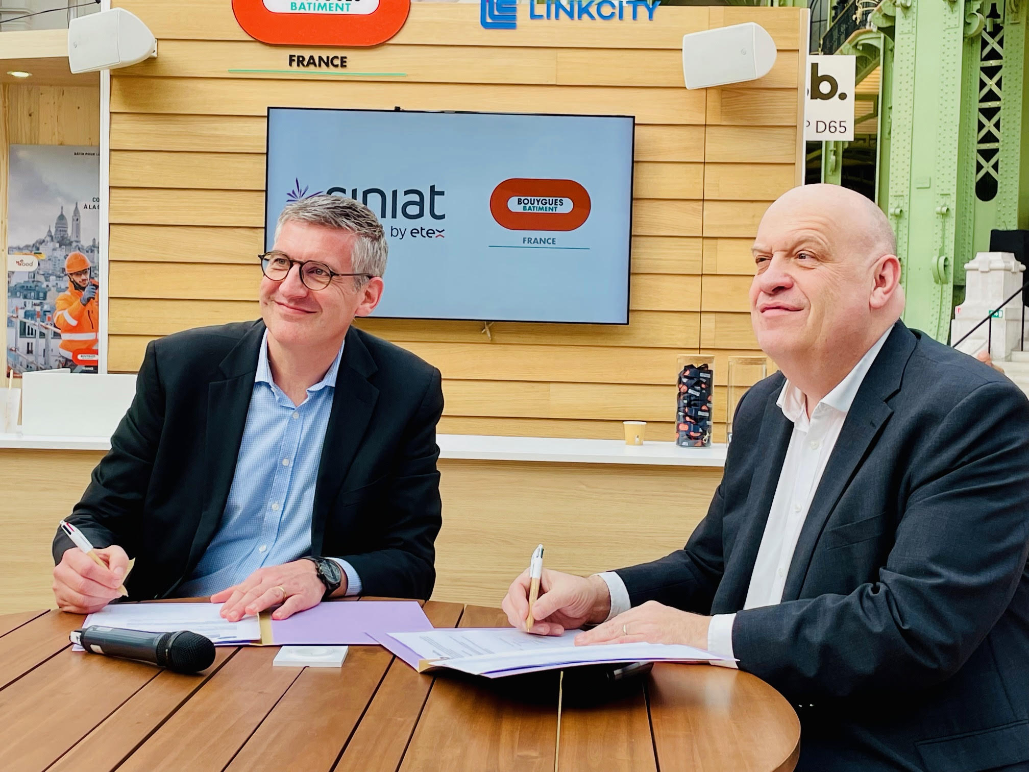 C’est sur le Forum Bois Construction que Bouygues Bâtiment et Siniat (groupe Etex) ont officialisé un partenariat stratégique visant à réduire l’impact carbone des projets de construction/rénovation grâce au développement d’une cloison à ossature bois. Frédéric Guetin (directeur général d’Etex France Building Performance) et Christophe Lemaître (directeur de la Construction Bois pour Bouygues Bâtiment France) ont signé un contrat exclusif d’une durée de 3 ans maximum, pour la mise en œuvre exclusive d’un nouveau type de cloisons séparatives qui marient ossature bois, isolant biosourcé (laine de bois) et plaque de plâtre.