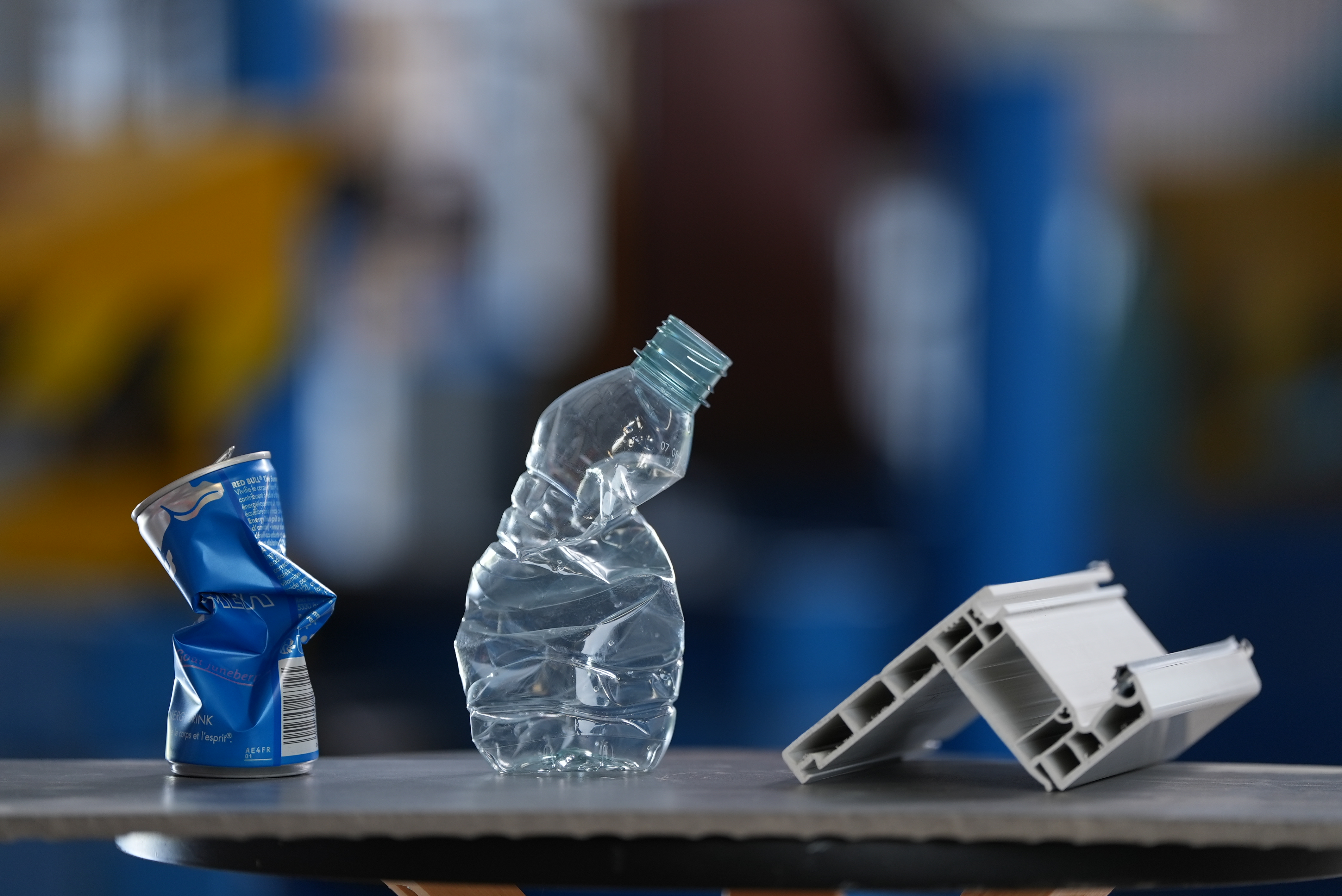 Uniso isole avec des bouteilles et des cannettes recyclées