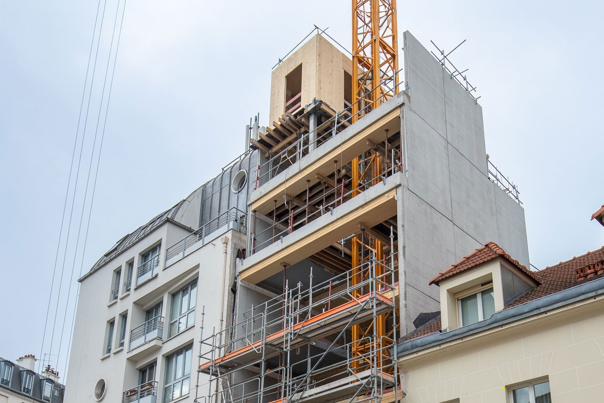 Dans le cadre d’une opération de renouvellement urbain en plein 14e arrondissement parisien, un immeuble datant des années 1980 – non conforme au PLU et présentant des malfaçons structurelles – a été déconstruit pour laisser place à un nouvel immeuble en R+6 répondant lui parfaitement aux règles en vigueur. Les architectes précisent : « La parcelle présente des singularités qui orientent le projet dans son implantation et son dessin. Une petite parcelle (110 m²) asservie d’un contrat de cour commune et d’une servitude de vue qui impose des gabarits-enveloppes avec la parcelle voisine ». Les concepteurs précisent vouloir faire écho au patrimoine parisien par l’usage de matériaux nobles, pérennes et éco-responsables comme le bois et la pierre, dans une démarche de renouvellement urbain contemporain. « Les dispositions de la parcelle et l’échelle du projet nous conduisent à proposer pour ce programme un édifice dont l’ossature primaire structurelle des logements sera assemblée en filière sèche grâce à l’assemblage de murs en bloc de pierre massive et une ossature en bois massif pour les planchers et façades en attique ».