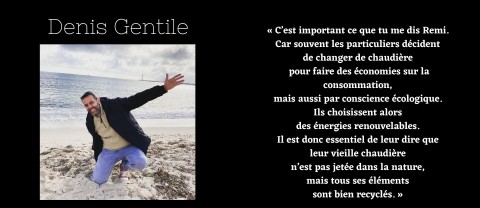 Denis Gentile Storyteller« C’est important ce que vous expliquez. Car souvent les particuliers décident de changer de chaudière pour faire des économies sur la consommation, mais aussi par conscience écologique. Ils choisissent alors des énergies renouvelables. Il est donc essentiel de leur dire que leur vieille chaudière n’est pas jetée dans la nature, mais que tous ses éléments sont bien recyclés. »
