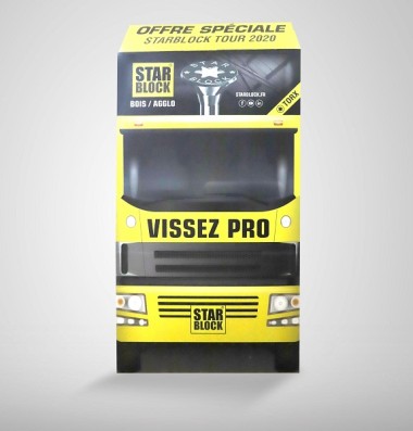 « Nous voulons créer concept de vente original et incitatif grâce à l’utilisation de codes couleurs. L’objectif est vraiment d’arrêter le client. Il s’agit de l’interpeller en rayon, argumente Olivier Le Guellec. Cette opération concerne uniquement notre vis bois/agglo qui est un produit à forte rotation. Nous en profitons pour y adosser une opération promotionnelle avec pour une boîte achetée, la seconde à moitié prix. Nous cherchons un effet volume aussi bien dans la présentation que dans la génération de chiffre d’affaires. » Le concept Starblock’Truck se présente comme un dispositif prêt à vendre. S’il n’est pas modulable, Olivier Le Guellec tient à préciser que « toute l’installation est réalisée par notre équipe commerciale, le distributeur ne s’occupe de rien. L’objectif est triple : apporter de la valeur ajoutée, éviter la banalisation de l’offre et assure une vente efficiente grâce à la mise en place d’un véritable vendeur muet ». Franck Guidicelli