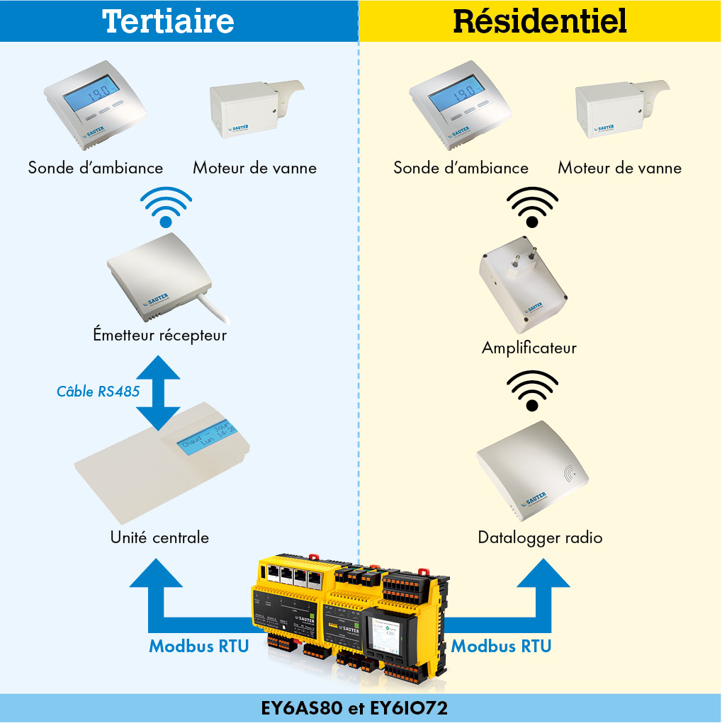 HeatEco Control est une solution de régulation destinée aux installations de chauffage sur boucle d’eau chaude, notamment en rénovation. Le système associe des servomoteurs radio sur vannes de radiateurs, des boîtiers d’ambiance par pièce et un automate modulo6 en chaufferie. La communication radio permet une régulation terminale conforme au décret 2023-444. L’automate assure l’auto-adaptation de la courbe de chauffe selon les apports extérieurs, le gain solaire et les besoins réels. L’auto-apprentissage calcule la température de départ optimale, intègre la détection d’ouverture de fenêtre, la programmation horaire et un serveur web pour le pilotage local ou distant.