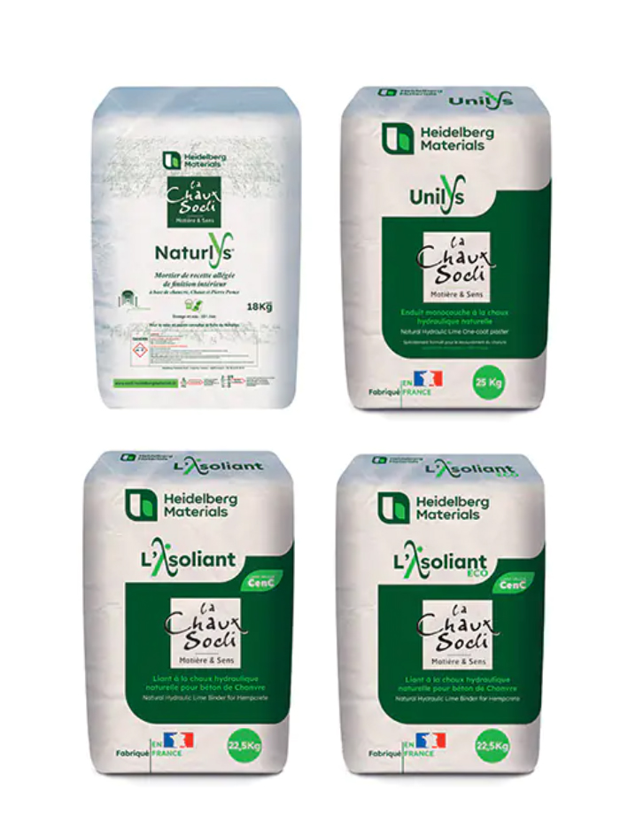 Fabriquée en France, la gamme Socli de Heidelberg Materials comprend quatre solutions techniques pour le béton de chanvre. Socli Isoliant, à base de chaux hydraulique naturelle pure, offre une excellente respirabilité, une isolation thermique (λ = 0,087 W/m.K) et une résistance mécanique supérieure à 0,7 MPa. Sa version Eco, sans ciment, réduit l’empreinte carbone et améliore encore la performance thermique (λ = 0,073 W/m.K). Socli Naturlys, enduit allégé à base de chènevotte, allie esthétique et correction thermique. Enfin, Socli Unilys, enduit monocouche prêt à l’emploi, assure une finition durable et respirante.